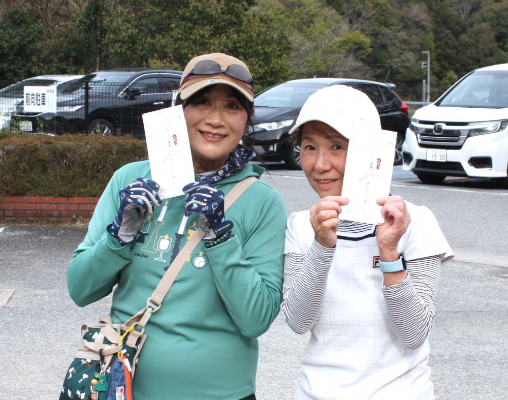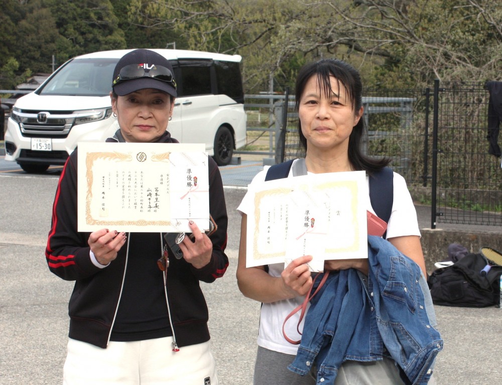 女子準優勝の礒野・久保ペア(上の写真) 礒野さん「雨の中、頑張ってよかった」、久保さん「同じです」