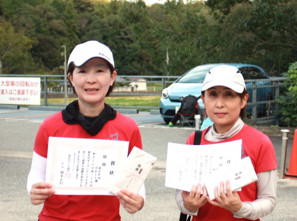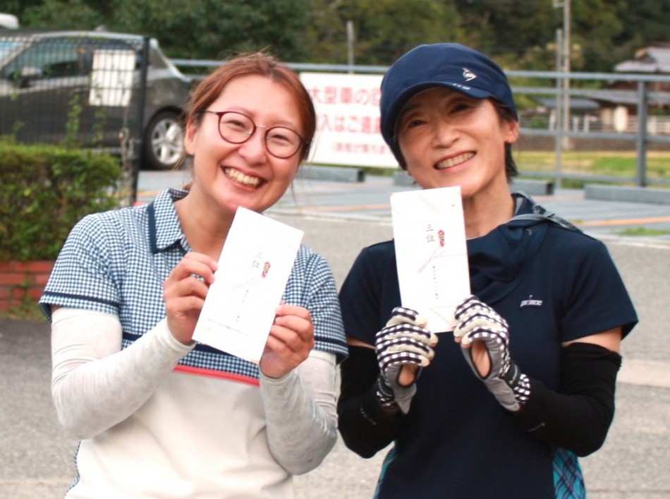 |  女子ダブルスコンソレ優勝 長佐古・川上ペア (リハートクラブ) 長佐古さん「優勝できてうれしい」 川上さん「猪名川で優勝できたのは、初めて」 |